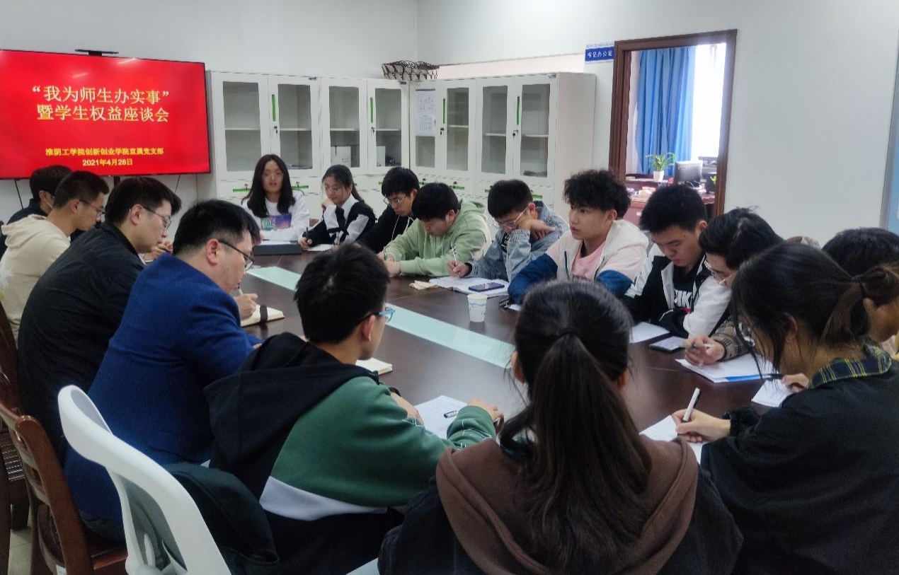 为扎实开展好党史学习教育“我为师生办实事”实践活动,创新创业学院直属党支部于4月28日在逸夫楼806会议室召开学生权益座谈会。会议由学院直属党支部书记刘毅主持,副院长赵坚、学生会成员以及学生代表参加会议。