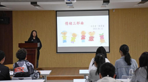 张菁莲以“情感三部曲”为主题,通过小游戏互动的方式激起在场学生的兴趣,让大家参与其中,调动大家的积极性。讲座期间,她通过身体密码的例子引出了“情感三部曲”,即:觉察、倾听和抒发,同时,运用幽默诙谐的语言讲解了“哀伤五阶段”,并且告诉在座学生“接纳每一种情绪”。最后,她通过音乐的方式让在座同学感受“音乐催眠”。