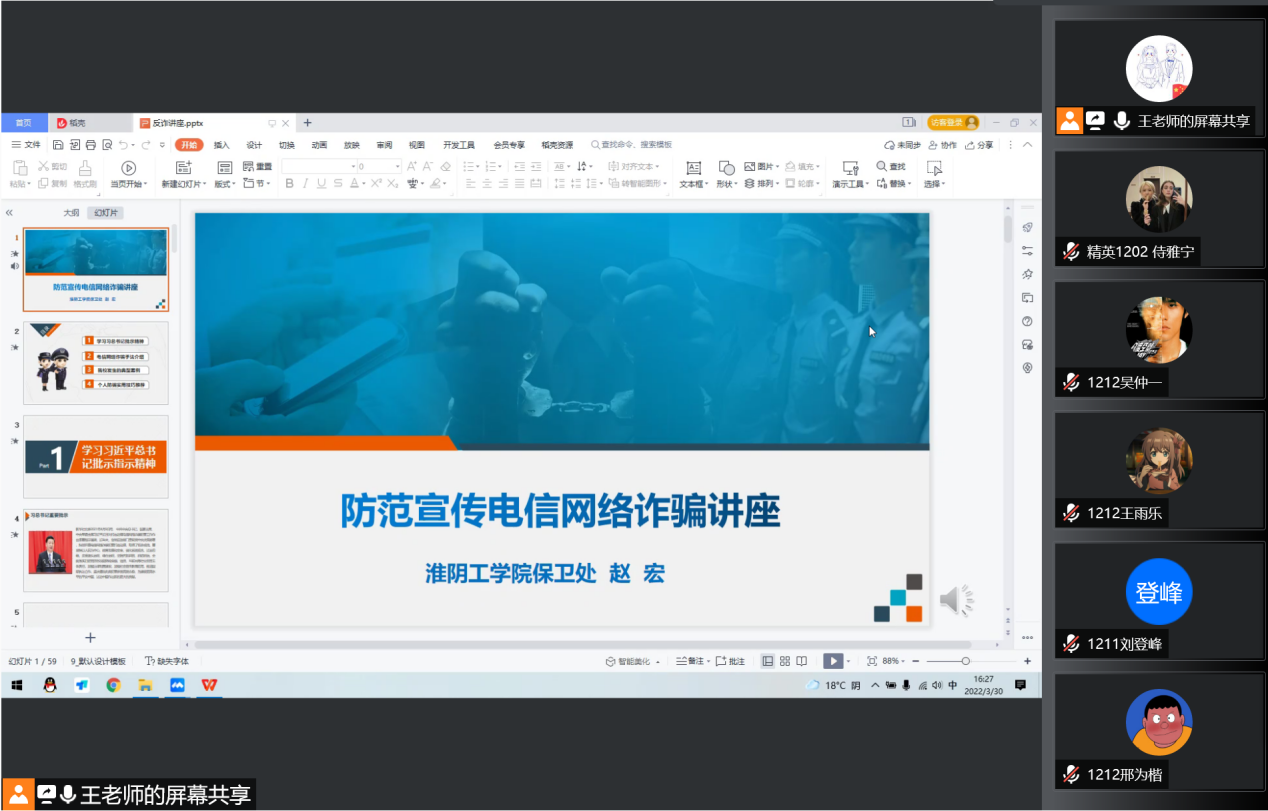 多措并举,推进“无诈学院”创建。学院领导班子高度重视学生防诈骗工作,先后召开支委会、党政联席会研究学生防范电信网络诈骗工作,制定“无诈学院”创建工作方案,成立防范电信网络诈骗工作领导小组,书记、院长担任组长,各辅导员、班主任担任组员,层层落实防诈骗工作要求。学院召开“无诈学院”动员会、主题班会,签订防范电信诈骗风险告知书,开展反诈防骗问卷调查,每周定期推送反诈骗微信,张贴防诈宣传海报,开展防诈骗知识竞赛,开展反诈防骗知识讲座,切实将开展学生防范电信网络诈骗工作既做出特色,又做出成效。分年级召开防诈骗专题家长会,形成覆盖全体师生、延伸到学生家长的反诈防骗新格局。同时,督促学生安装“淮安防骗宝”和“淮上反诈金钟罩”微信小程序,并通过班会、宿舍走访等形式进行抽查,确保学生将软件既装上又用上。