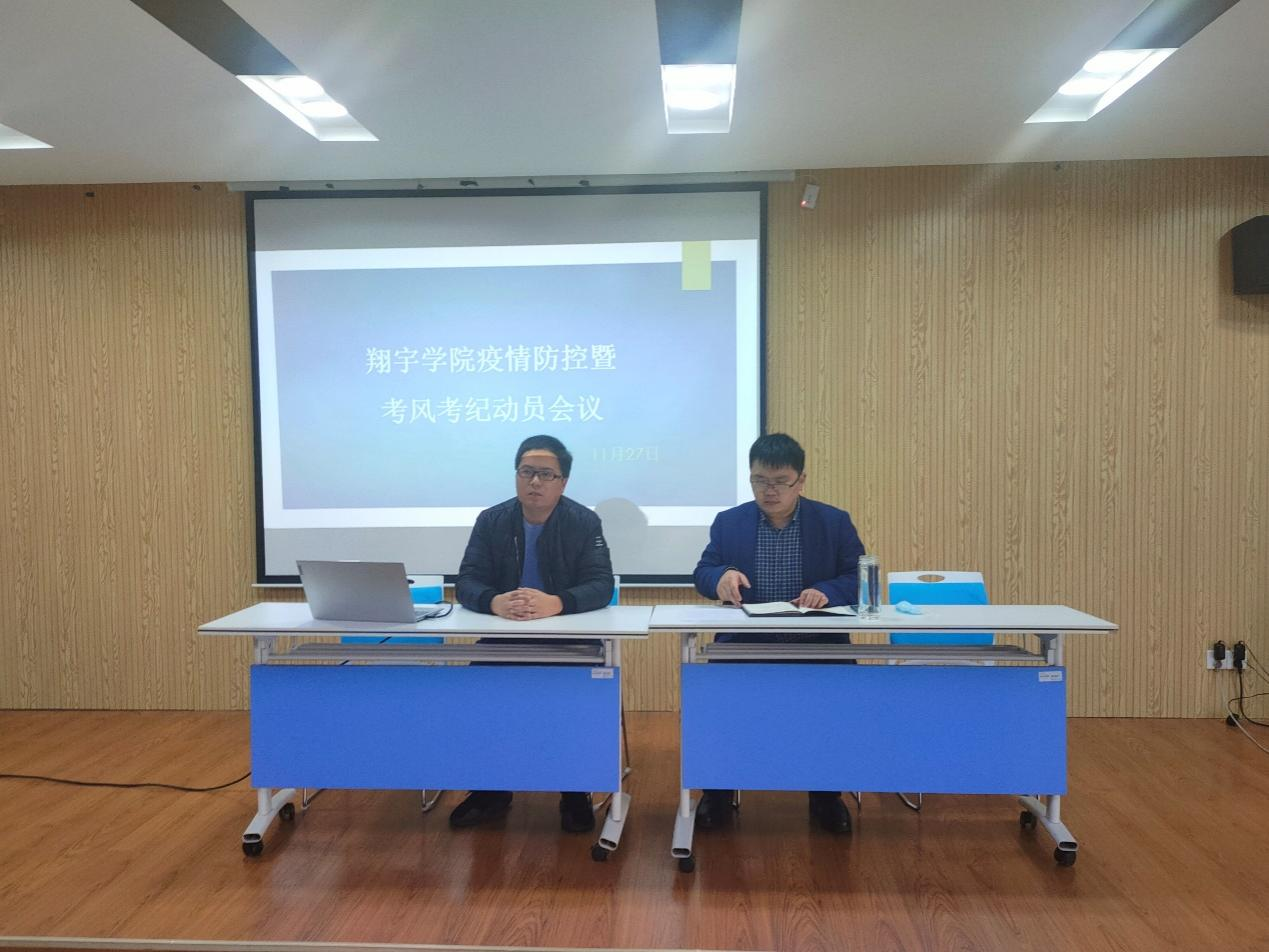 为进一步落实疫情防控相关要求,加强学风建设,端正考风、严肃考纪。我院于11月27日下午线上线下同步召开疫情防控暨考风考纪动员会议,学院直属党支部书记刘毅、学工办副主任王云飞出席并讲话。各班长团支书生活委员于逸夫楼814线下参会,其余同学线上参与。