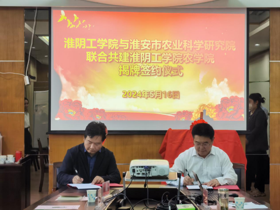 5月16日下午,我校与淮安市农业科学研究院联合共建淮阴工学院农学院,揭牌签约仪式在淮安市农业科学研究院科研创新基地举行。党委副书记、校长郑锋,党委常委、副校长高尚兵,淮安市农业科学研究院党委书记、院长彭杰,淮安市农业科学研究院党委副书记章安康出席签约仪式。