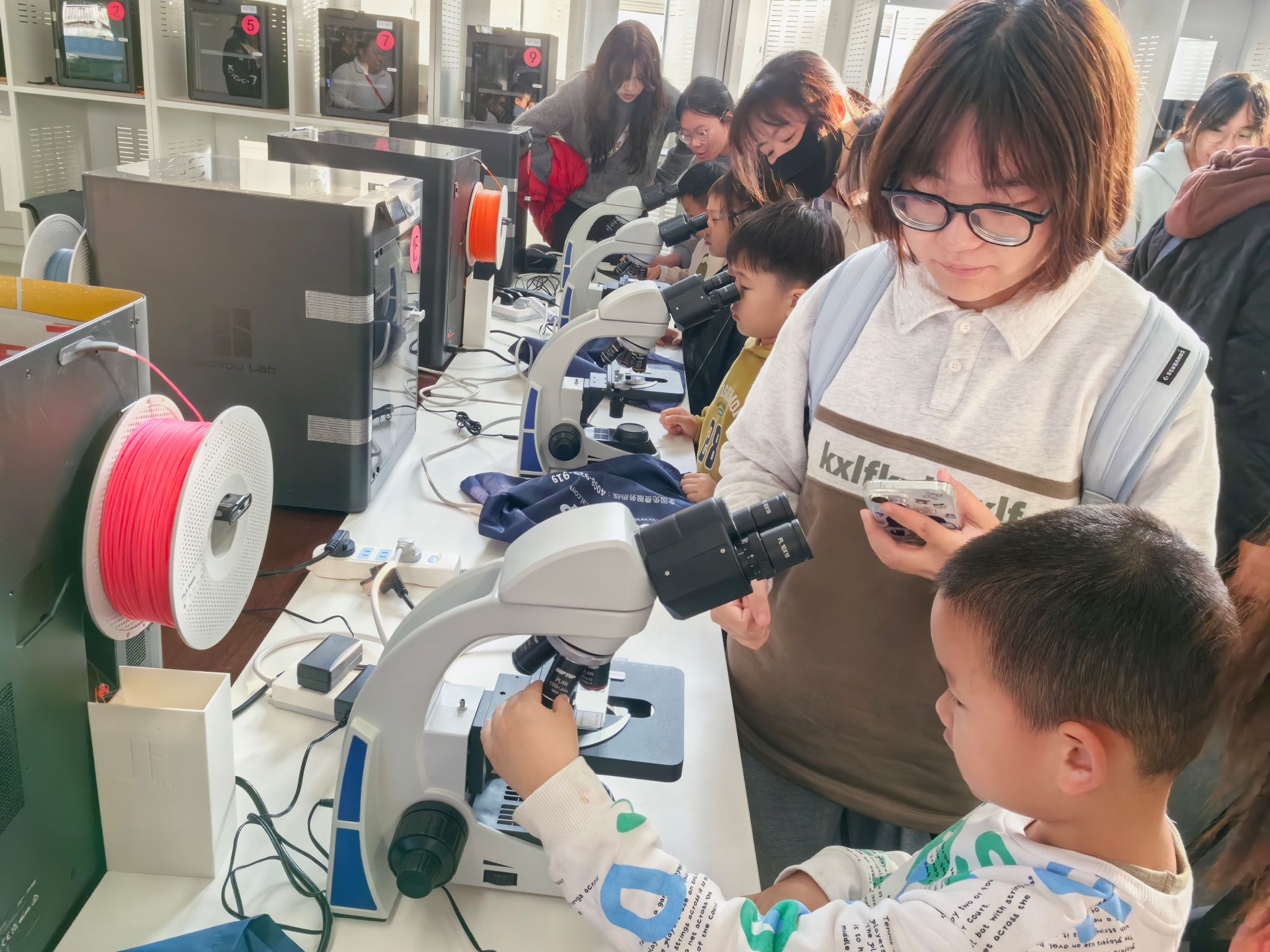 走进微观世界探秘的课堂,生命科学学院的志愿者们早已准备好显微镜。当奇妙的植物细胞世界清晰地呈现在眼前时,一阵阵惊呼此起彼伏,科学的种子悄然播撒。