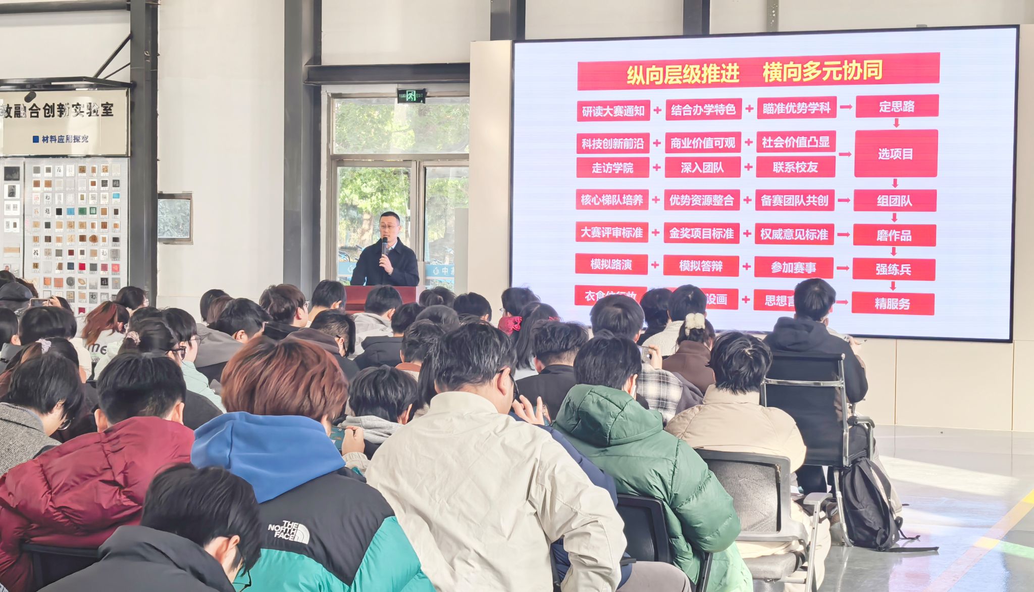 在讲座中,刘老师重点讲解了项目选题策略与团队建设方法,为我校师生指明了备赛方向,并通过详实的案例解析,从优秀项目的评估关键、参赛材料制作原则、初次参赛的破解之法以及进阶参赛者的提升方向四个方面展开讲解,为师生提供了可借鉴的实践范本。