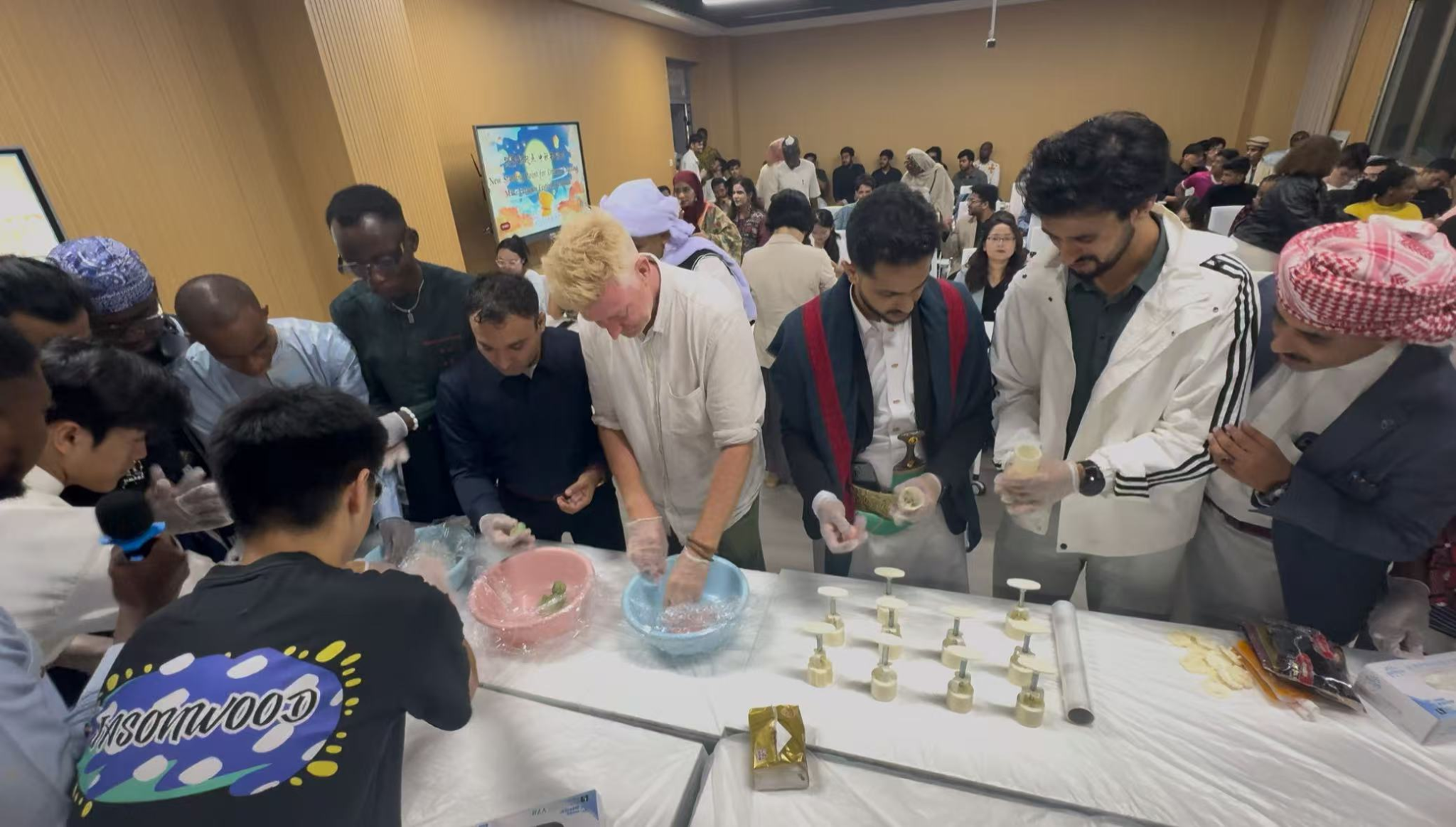 文化体验环节紧随其后。中秋主题短视频从嫦娥奔月传说到赏月、猜灯谜习俗,让留学生直观了解节日渊源,中国新生亦重温记忆。最受期待的冰皮月饼制作环节中,志愿者指导中外新生动手实践,大家互帮互助,生疏的留学生在同学协助下做出精致月饼,香甜气息与欢呼声交织,满是团圆味。